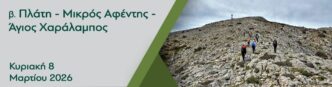 Κυριακή 8 Μαρτίου 2026 Η διαδρομή μας έχει ως αφετηρία την Πλάτη (852μ). Θα ακολουθήσουμε μονοπάτι και κατόπιν χωματόδρομο για να ανέβουμε …