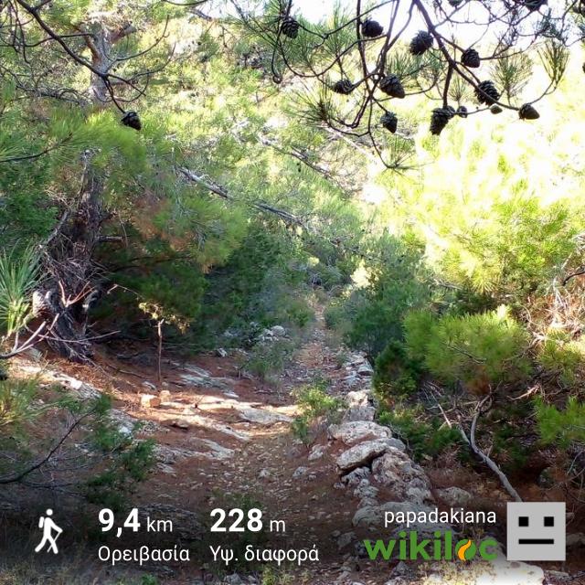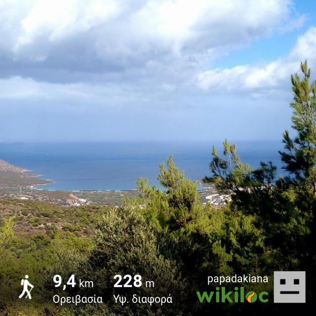 We start from the village of Pyrgow, at 50m a.s.l. We follow an old but well-marked path at first along a dirt road and later along a path through a pine-tree forest until we reach the village of APrina, at 360m.