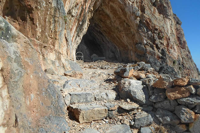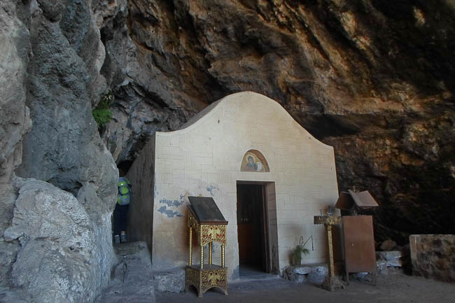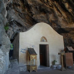 Τρίτη στάση στο σπήλαιο του Αγίου Αντωνίου, παλιό ησυχαστήριο πολλών ερημιτών που κυριολεκτικά κρέμεται πάνω από το πέλαγος,  μετά από 2 περίπου χιλιόμετρα. Από τους σταλακτίτες στην οροφή της σπηλιάς στάζει νερό που συλλέγεται σε στέρνες και θεωρείται αγίασμα. Σήμερα έχει κτιστεί μικρό εκκλησάκι αφιερωμένο στον Άγιο Αντώνιο.