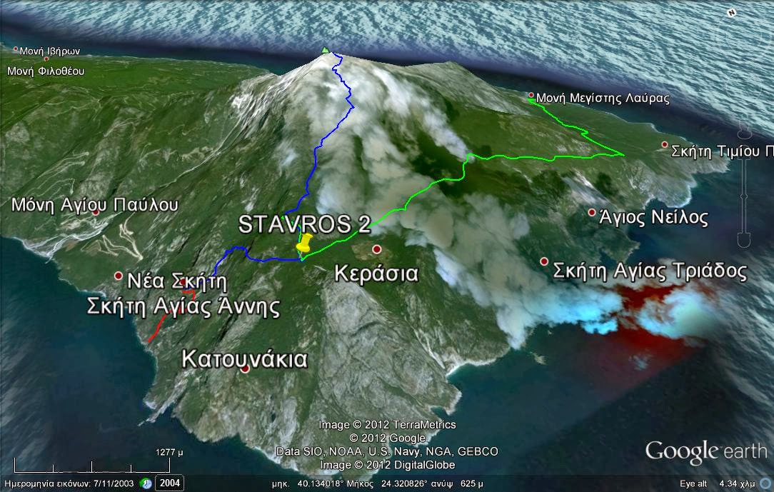 Περπατάμε από την ΙΜ Μεγίστης Λαύρας, επισκεπτόμαστε την ΙΜ Τιμίου Προδρόμου και καταλήγουμε στην Ι Σκήτη της Αγ. Άννας, όπου ευελπιστούμε να μπορέσουμε να φιλοξενηθούμε, για να ξεκινήσουμε την ανάβαση μας προς την κορυφή ενωρίς το πρωί. (Για διοικητικούς λόγους οριστική απάντηση στο αίτημα μας θα έχουμε μετά την 21η Μαΐου).