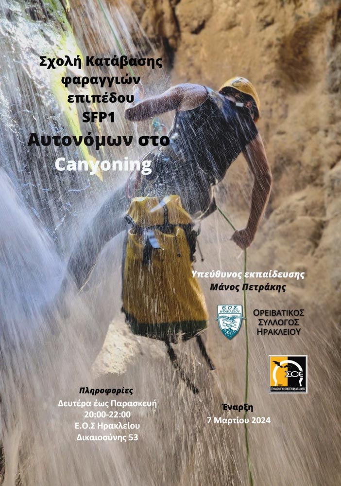 Ημερομηνίες διεξαγωγής της σχολής είναι για μεν το θεωρητικό η Πέμπτη 7 Μαρτίου 2024 στα εντευκτήρια του ΕΟΣ Ηρακλείου, για δε το πρακτικό σε φαράγγια τα Σαββατοκύριακα 9-10, 16-17 και 23-24 Μαρτίου 2024.