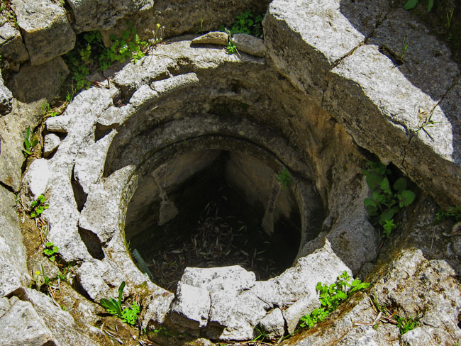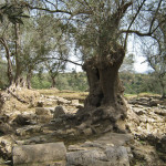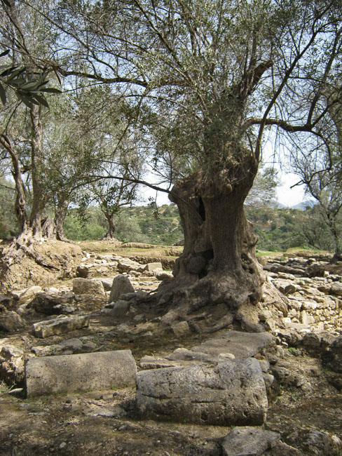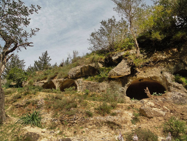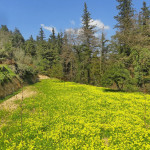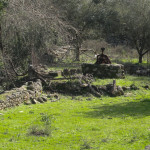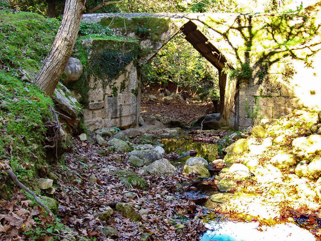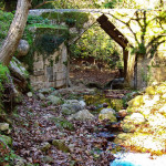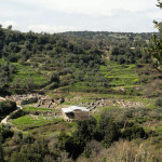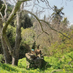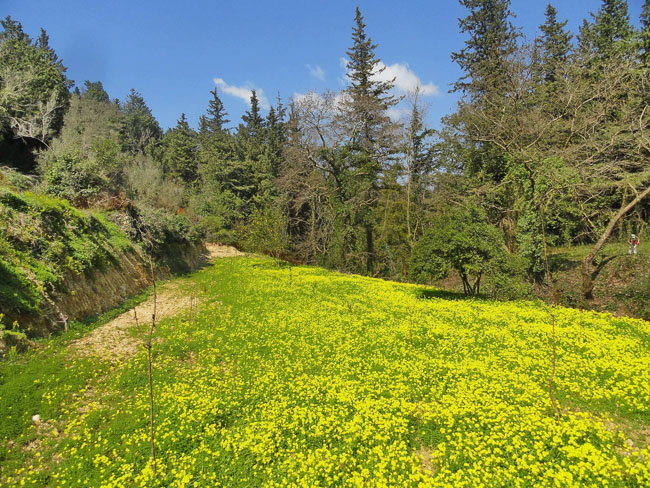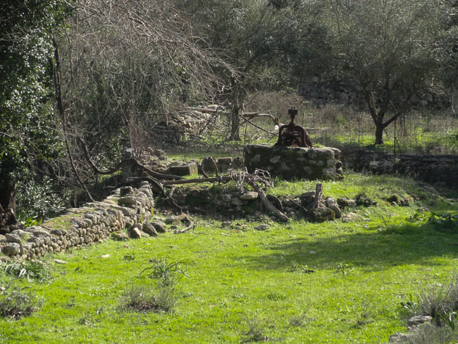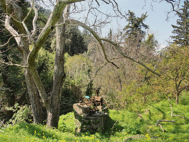 Πετρόχτιστες πεζούλες με πράσινο χορτάρι και εγκαταλειμμένα δένδρα με πορτοκαλιές, μικρά αλσύλλια κυπαρισσιών σπαρμένα με κυκλάμινα ,πεσμένοι κορμοί δένδρων και ξερά κλαδιά  που πρέπει να σκύψουμε για να περάσουμε, πηγάδια ανοιχτά δίπλα μας με τα σκουριασμένα τους μαγκανοπήγαδα μας μεταφέρουν σε άλλες εποχές.