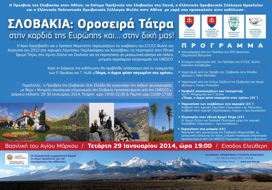 Την Τετάρτη 29 Ιανουαρίου ο ΕΟΣ Ηρακλείου σε συνεργασία με τον ΕΠΟΣ Φυλής και την πρεσβεία της Σλοβακίας θα διοργανώσουν στη Βασιλική του Αγίου Μάρκου εκδήλωση με θέμα Σλοβακία: Οροσειρά Tatra, στην καρδιά της Ευρώπης και στη δική μας.